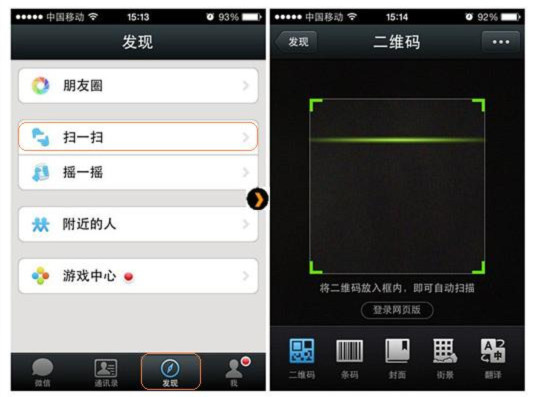 2.进入微信客户端后,下方会有几个选项,点击“发现”