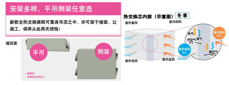 | 使用全热交换器换气系统,可以将室外污浊空气进行双重过滤引到室内,将室内的污浊空气有效的排出室外,通过24小时不间断换气,使住宅整体保持新鲜空气的流通,由全热交换器进行换气即使使用冷暖器也不易造成能量损耗。 |